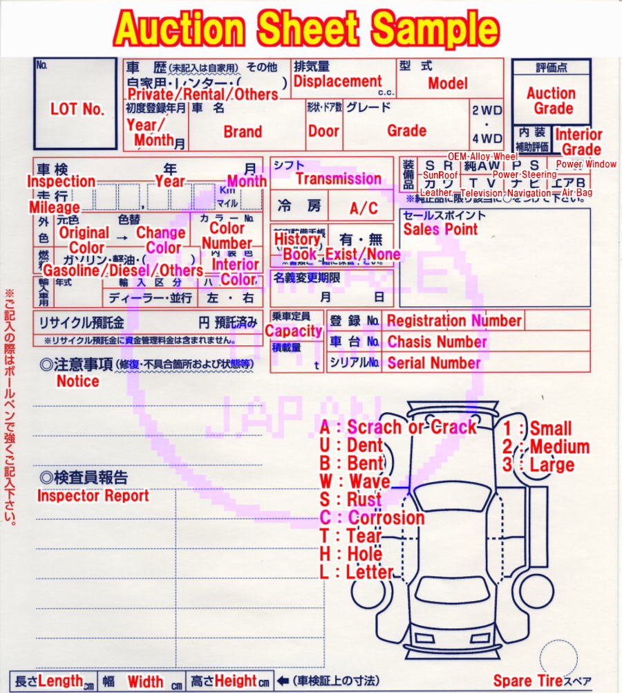 Auction sheets vary from auction to auction but basically they contain the same infomration. Please check below the basic fields